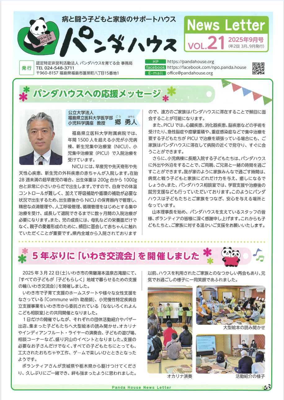 認定特定非営利活動法人パンダハウスを育てる会の活動や近況をお知らせするために、年に2度ニュースレター NEWS LETTERを発行しています。パンダハウスへのご支援をいただいた企業・個人の皆様や賛助会員の皆様へお送りしております。